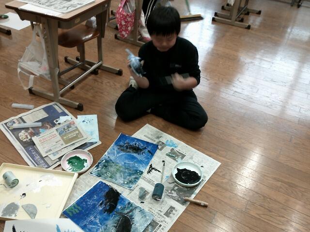 3年生は、紙版画に挑戦です。思い思いの形をはさみで切り、絵の具で色をつけてから台紙に写していきます。地道な作業ですが、とてもカラフルな作品が仕上がりつつあります。