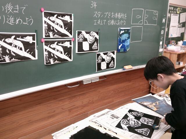 4年生は木版画です。彫刻刀を器用に使いながら彫り進め、黒インクを塗って刷ります。細かく、丁寧な作業が求められますが、納得のいく作品になったようです。