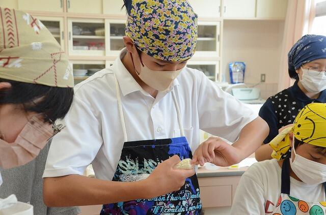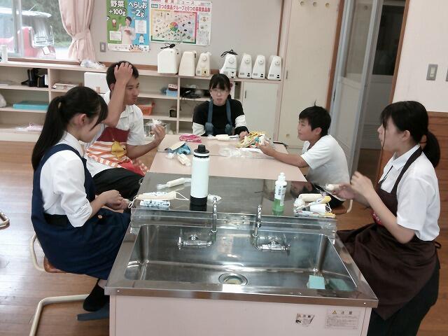 事前にアンケートをとった結果、フルーツ・たまご・ハムチーズとジャムの3種類を作ることに。グループに分かれ、身支度を整えてから作業開始です。缶詰を開けホイップクリームと混ぜ、ゆで卵をつぶして塩こしょうとマヨネーズで味付け、ハムとチーズと並べて準備完了。好きな具材を選び、パンに塗ってからラップでまいていきます。あっという間に、たくさんのサンドイッチができあがりました。