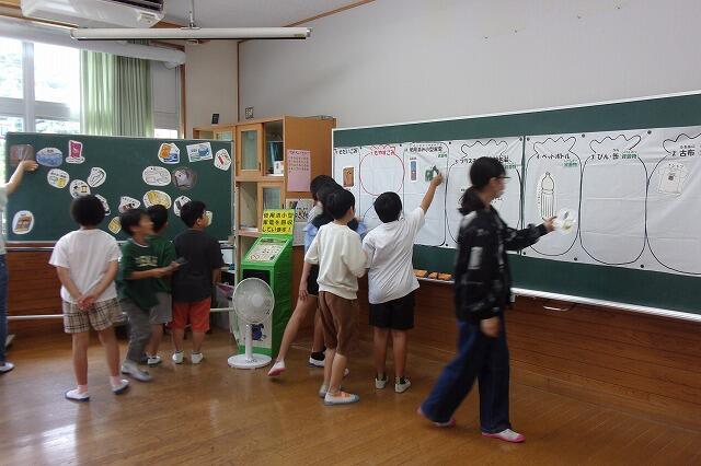 黒板にゴミを分別するためのシートが貼られ、子どもたちはみんなで意見を出し合いながら、たくさんの種類のゴミを分別していきました。なんとか全部の分別が終わったところで、答え合わせ。見事、全問正解でした。そして、講師の方から詳しい説明です。クイズなどで盛り上がる中、私たちにできそうなこととして、食品ロスの話が出ました。「もったいない」という言葉もあります。好き嫌いを減らし、できるだけ食品ロスをなくしていきたいですね。今後の生活に、役立てていってほしいと思います。