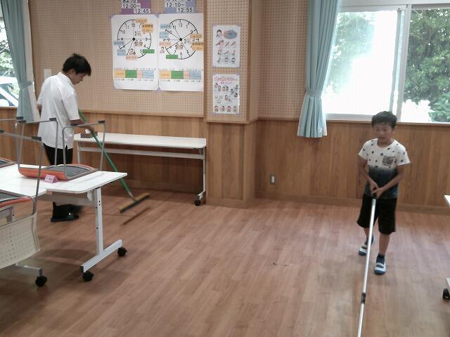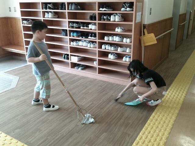 本校は人数が少ない上に普通教室や特別教室などがたくさんあり、掃除も大変です。そこで、曜日ごとに場所を決め、分担しながら掃除しています。今日は、靴箱・IoT室・体育館など、普通教室・トイレ以外の場所を掃除していました。