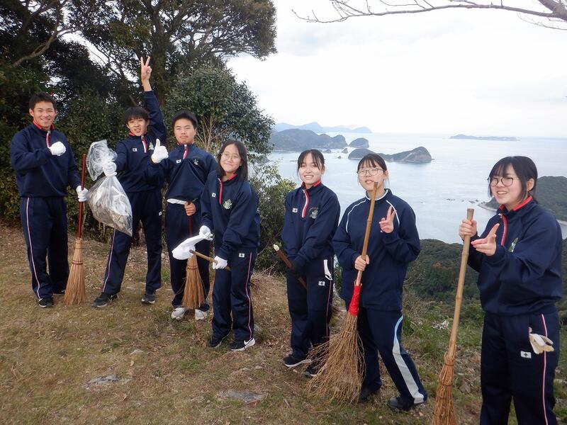 今日は後期課程の7人が、島のシンボルである遠見場山(とんばやま)の清掃活動を行いました。