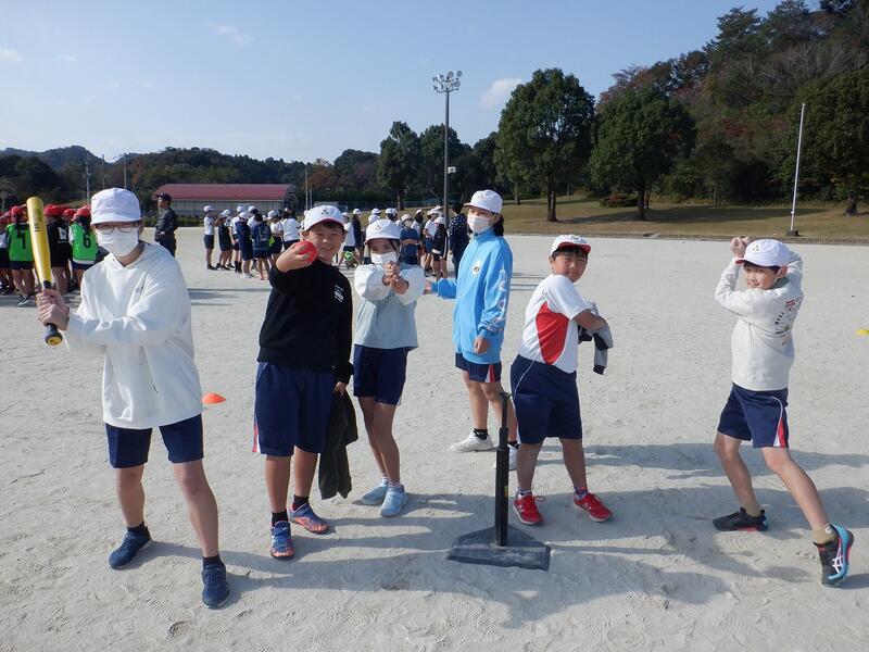海上タクシーで島を出て、バスで会場へ。開会式の後、午前中はとなりの補助グラウンドで野球を体験しました。講師の先生にごあいさつをして、まずは1人でボール遊び、次にペアになってゴロをキャッチする練習です。専門的な指導を受け、かなり上達しました。投げるコツを教えてもらってキャッチボールをした後、最後に簡単なゲームをしました。大きな学校の中に混ざり始めは恥ずかしそうでしたが、ナイスプレーがたくさん見られました。
