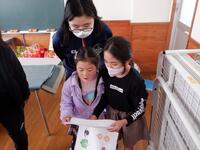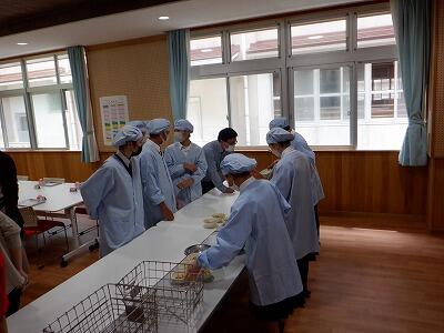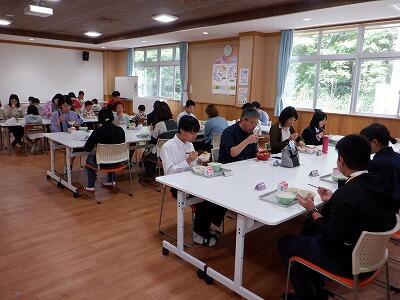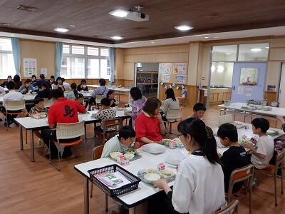 本校の児童生徒は19人。少ない人数だからこそできることとして、全校児童生徒と職員とが一緒に給食を食べています。準備も片付けも、みんなで協力して行い、アットホームな雰囲気で時間が過ぎていきます。また、となりの給食室で作ってくださっているので、いつもできたてのおいしい給食をいただいています。