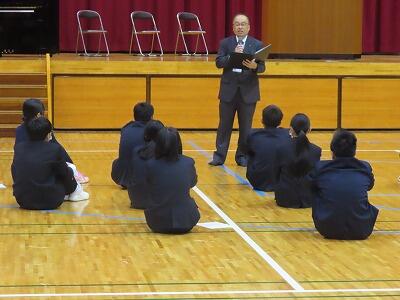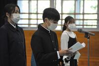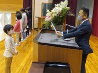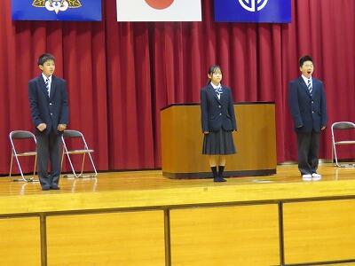 次に始業式です。児童生徒代表で、新4年生と新8年生が1学期の目標を熱く語ってくれた後、新しく後期課程へとステップアップした新7年生の3人が制服の披露と決意表明を行いました。校長からは、今年1年「あいさつ」と「返事」を頑張ろうという話がありました。