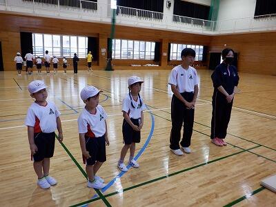 まずは体育館で説明を聞き、準備運動をした後、3つのグループに分かれます。どのグループも、前期課程と後期課程が一緒になり、後期課程のお手本を見ながら前期課程も自分の力を発揮するという、本校ならではのスタイルで行いました。