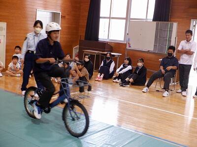 次に、正しい自転車の乗り方についてです。自転車に乗るときも、必ず周囲を確認します。代表の3人が、とっても上手にお手本を見せてくれました。