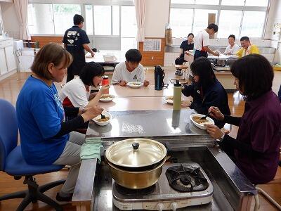 そしていよいよ昼食作り。メニューは定番のカレーです。3つのグループに分かれ、野菜を切って肉を炒め、煮込みます。と、ここでそれぞれが選んだ隠し味を投入。リンゴ、バナナ、みそ、にんにく、はちみつ、インスタントコーヒー・・・。これが、味の決め手となりました。できあがったところで、一斉に「いただきます」。3つの味を楽しみながら、おいしくいただきました。