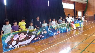 3時間目の図工的活動では、広い紙に手や足、ローラー等を使って海を描き、それぞれ持ち寄った魚の絵をその海に貼り付けました。手や足を上手に使い、みごとな海ができました。