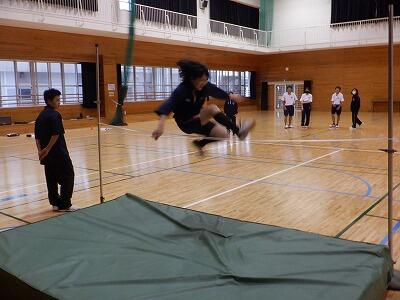 6時間目は後期課程です。後期課程の生徒は、走り高跳びにチャレンジしました。まずは教科書を見ながら跳び方の確認をし、マットとポールを設置してから実際に跳びました。始めは低いので余裕で跳べていましたが、だんだんと高くなると表情も真剣そのもの。中には、130cmを軽くクリアする人もいました。