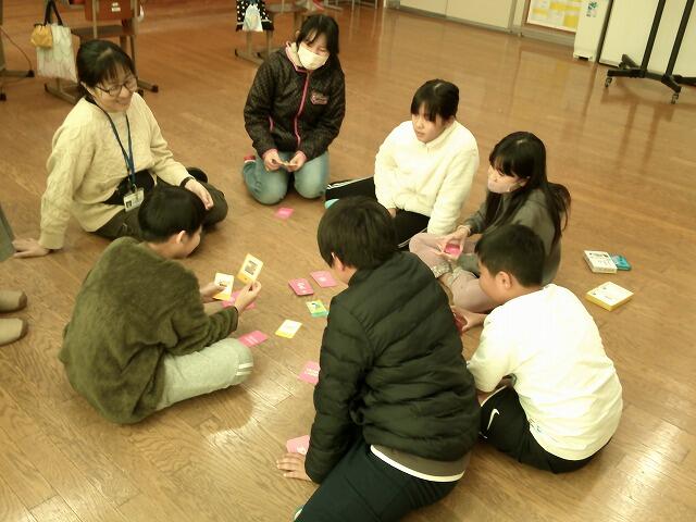 次は、配られたカードに書かれた役割を演じながら、だれが何の役割かを探り合うゲームです。お互いの表情や話す内容から、最終的にそれぞれの役を当てます。授業中の話合い活動とはまた違った雰囲気で、笑顔がいっぱいあふれていました。