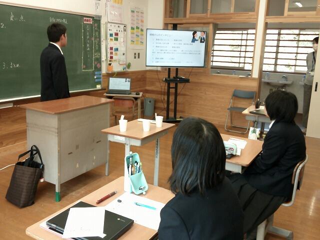 川南町の中学校をメイン会場とし、県内5つの中学校(義務教育学校)がオンラインで繋がり、北海道根室市の高校生も参加して、北方領土に関する説明を聞いたり、直接質問したりしながら、この問題について真剣に考えていました。本校生徒も、「島民のお墓をロシアの方が大切にしてくれていると聞いたのですが」「根室高校とロシアとはどのような交流をしているですか」「宮崎の私たちができることは何がありますか」など、3人とも質問をしていました。
