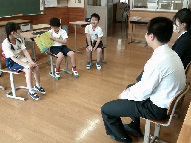 始めは少し緊張気味でしたが、読み聞かせが始まるとさすが、元気いっぱいの子ども達。かわいらしい絵本やトリックアート、難しい植物の漢字クイズなど、いろいろなジャンルの本で中学生を楽しませていました。定期テストが間近に迫った中学生にとっては、テスト勉強の合間の、ほっこりした時間になったことでしょう。これもまさに、義務教育学校ならではの活動でした。