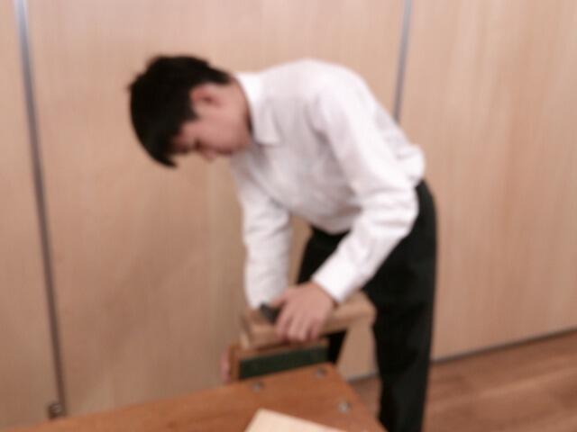 まず、1枚の板に線を引き、のこぎりで丁寧に切り分けていきます。切り口がぎざぎざになっているので、「かんな」で削ります。最近では滅多に見る機会のなくなった「かんな」ですが、子ども達はまるで職人さんのように器用に扱い、黙々と作業に取り組んでいました。このあと、釘を打って組み立てていきます。できあがった作品は、末永く、大切に使ってほしいものです。