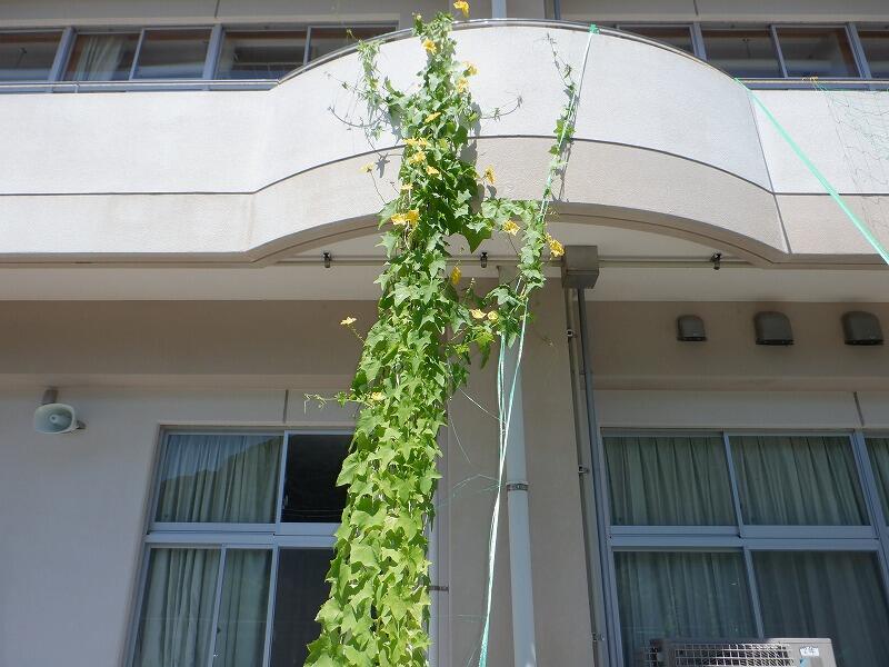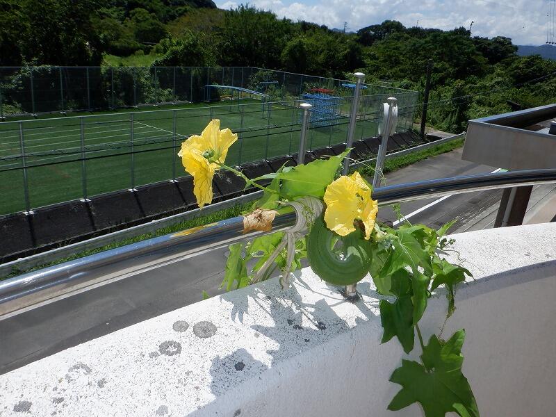 4年生が理科の観察で育てているヘチマが、この夏休みも順調に成長し、ついに2階のベランダに到達しました。さらに、これまで咲いていたのはほとんどが雄花だったのですが、こちらもついに雌花が咲き、実もつけ始めています。始業式の日、ヘチマの成長に驚く4年生の顔が、目に浮かびます。