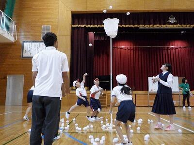 次に、体育主任の先生よりスポーツデイに向けた心構えのお話。体育大会実行委員より、応援や役割分担の話があった後、なんと、一足先に団対抗の競技「玉入れ」を行いました。今回は、勝ち負けを競うものではなく、全校でやったときの雰囲気を感じることが目的でした。スポーツデイ本番は、今月末、30日の月曜日です。