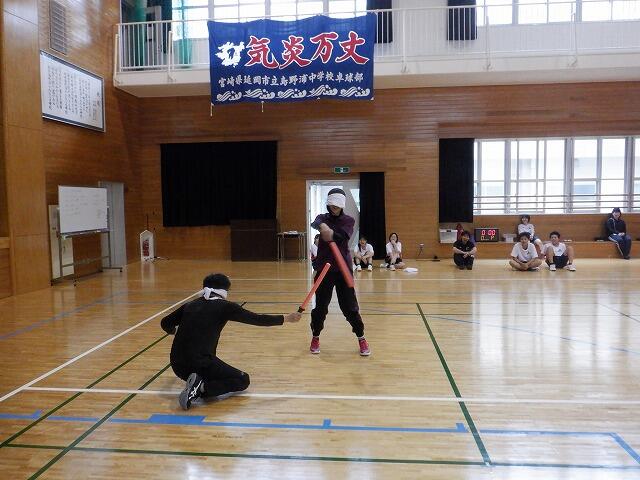 9年生の企画した「けはいぎり」は、目隠しをしてスポンジの武器を持ち、相手の気配を探りながら戦うという斬新なスポーツです。周りの声援を頼りに、おそるおそる近づき、熱戦を繰り広げていました。
