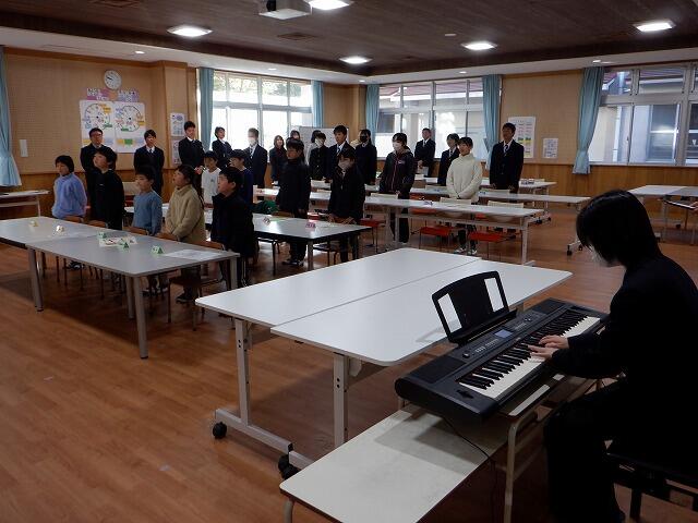 1時間目に行われた始業式では、まず5年生、7年生の児童生徒が、3学期の抱負について発表しました。校長先生からは、日々の生活の中で感謝の気持ちをもちましょう、というお話がありました。式の最後は恒例の、旧小学校・旧中学校の校歌を元気よく歌いました。