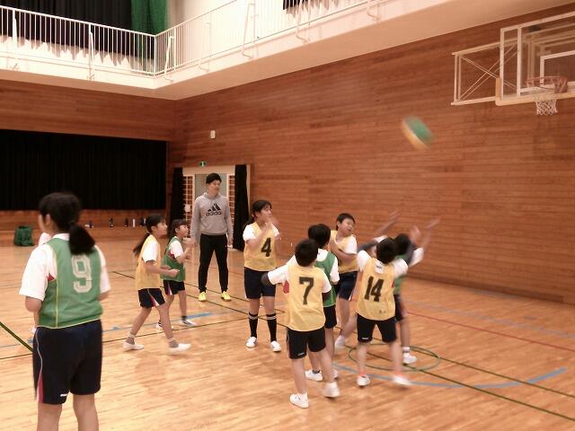 ポートボールという種目で、台の上に乗った仲間にボールを投げ、キャッチできたら得点が入ります。バスケットボールの前段階のスポーツになります。今日は初めてだったので、台は使わずに、床に置いたフープの中に入った人にパスが通れば得点、というゲームをしました。