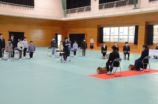 今日の5時間目、全校児童生徒が体育館に集まり、1回目の卒業式練習がありました。これまで、各クラスや音楽室で練習を重ねてきましたが、いよいよ、体育館に椅子を並べて本格的な練習のスタートです。