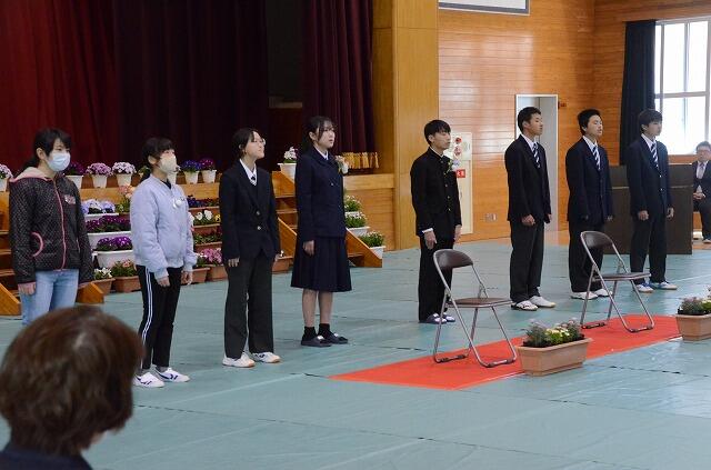 校長先生、区長様、PTA会長様より心温まるお祝いの言葉をいただいた後、いよいよ、これまでたくさん練習してきた「贈る言葉」です。在校生からの呼びかけ、生徒会長の送辞、卒業生の答辞。すべてがそれそれの思いをしっかりと伝えることができました。卒業式の歌では、少ない人数ながら、心をこめて、歌い上げました。そして、会場全体が1つになり校歌斉唱。小学校3番まで、中学校3番までのフルバージョンで、伝統をしっかりと引き継ぐことができました。