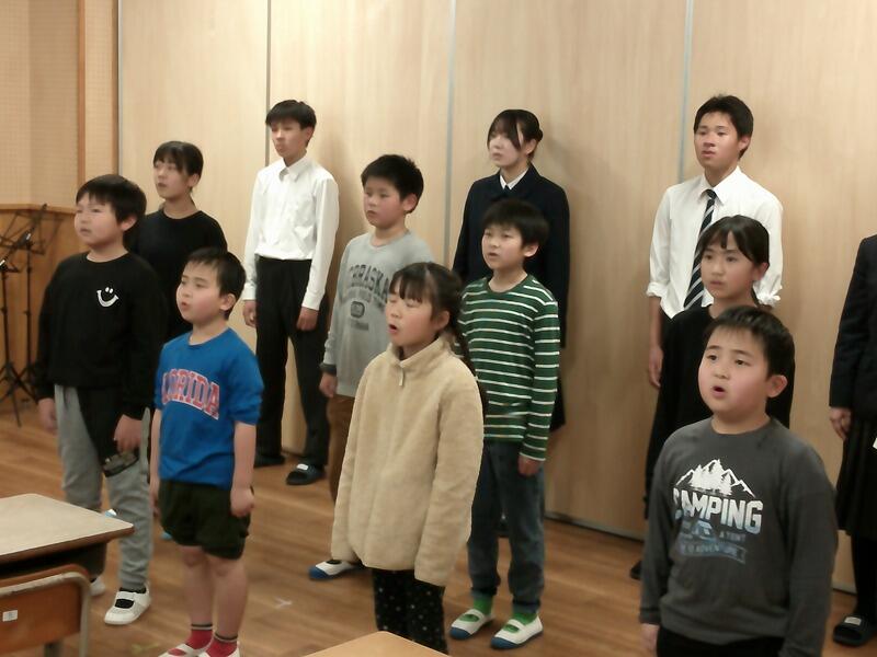 昼休みが終わり、音楽室に集合。体操と発声練習をして、準備はばっちりです。まずは、小学校の校歌を3番まで。途中、スクリーンに映していた歌詞が消える、というハプニングがありましたが、最後まで、心をこめて歌うことができました。