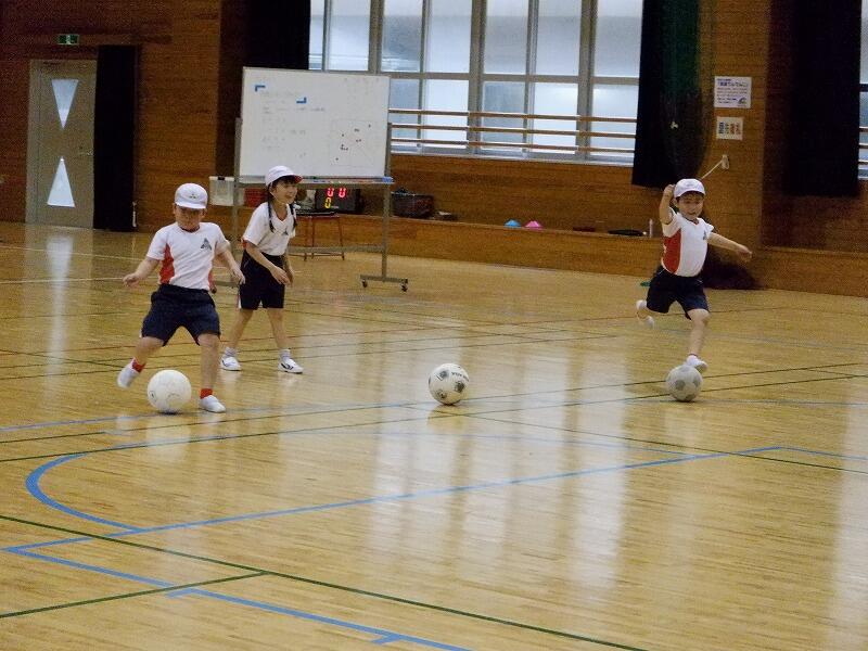 まずはドリブルからシュート練習。途中、担任の先生が立っていて、そこをくぐり抜けてシュートします。次に、マーカーやポートボール台、ホワイトボードなどの障害物をよけながらゴールのカラーコーンまで蹴って進む、ゴルフのような競技。微妙なコントロールが必要です。最後に、ゴールに置かれたカラーコーンをシュートで倒す練習。始めは遠くから蹴っていたのですが、なかなか倒れず、最後はかなりの至近距離から狙って見事に倒しました。