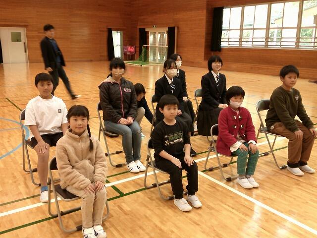 まずは体育館でお別れ集会です。児童生徒会を中心に、ほとんど子ども達の手で企画・準備してきました。アイスブレーキングで、じゃんけん大会をした後、早速、2・3年生の企画「以心伝心」からスタート。2チームに分かれて、「文房具」「動物」「アニメ」などの出されたお題に対して、9年生と答えを合わせる「心を1つに」と、逆に違う答えを出す「心をバラバラに」の2つのゲームです。チーム全員の答えがピッタリそろったり、逆に全く違ったり、とても盛り上がりました。