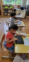 1・2年の生活科の時間に「生き物を探そう 観察しよう 育てよう」の内容で、1年生が初めてタブレットのロイロノートを使って学習しました。2年生が教える場面もありました。おたまじゃくの写真を撮りました。