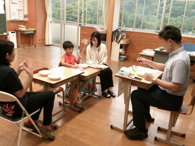 2年生の学級活動では、上手な箸の使い方について学習しました。担任のほか、学校栄養職員も授業に参加し、正しい箸の持ち方について学んだ後、スポンジ、輪ゴム、大豆を別のお皿に移し替える練習にチャレンジしました。はじめはぎごちなかったのですが、練習を重ねるうちにスピードが上がり、最後は参加者3人で競争をしていました。