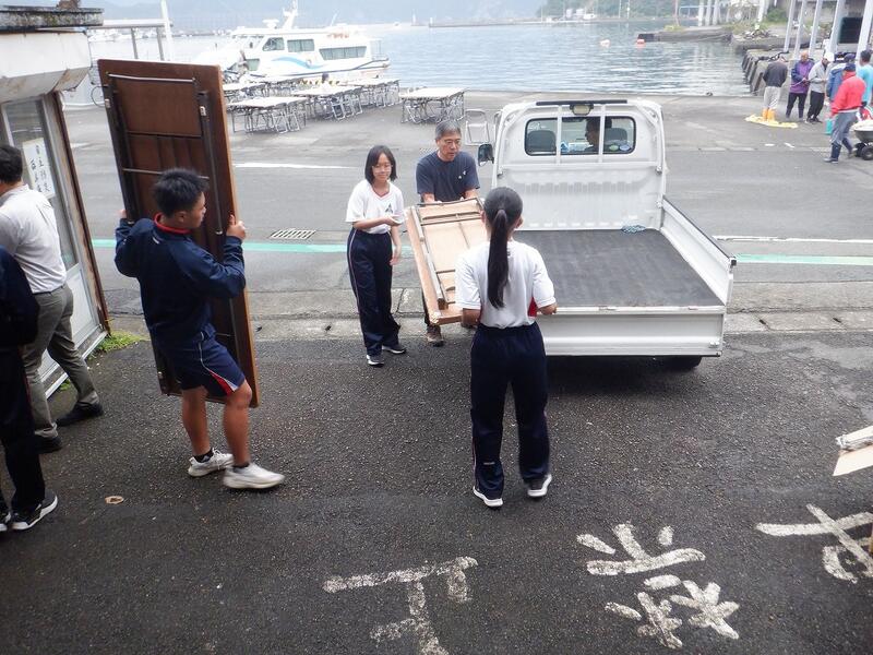 明日の神社大祭に備え、今日は朝から準備のお手伝いをしました。離島センターの3階から長机、椅子、テントを降ろし、前の広場に並べたり水揚げ場まで運んだりしました。島の一大イベントの運営に、少しでも協力することができたと思います。