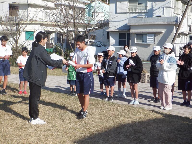 やすらぎ公園で全員で準備運動をした後、コースごとに試走をしました。ある程度の距離感をつかみ、1回目のタイム測定です。2・3年生は700m、4・5・6年生は1000m、8・9年生は2000m走ります。途中、島民の方々や保育所の子ども達から大きな声援をうけ、全員が見事に完走しました。今日のタイムをもとに、大会での目標を設定します。持久走大会本番は11日(水)、13:30から始まります。たくさんの応援をお願いいたします。