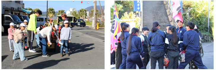 1年生~5年生は子供神輿と賽銭箱を持ってやすらぎ公園に移動し、子供神輿のコースを、ちょいやさちょいやさとかけ声を練習しながら実際に歩いてみました。神社下では6年生から9年生が獅子狛の練習をしました。神社下に全校児童生徒が合流し、ダイナミック琉球とダンス(ブルージーンズ)を練習したあと、水揚げ場に移動して、2度目のダンス練習を行いました。いよいよ待ちに待ったお昼ごはんです。離島センターに移動し、婦人会の皆さんが作ってくださったカレーをいただきました。