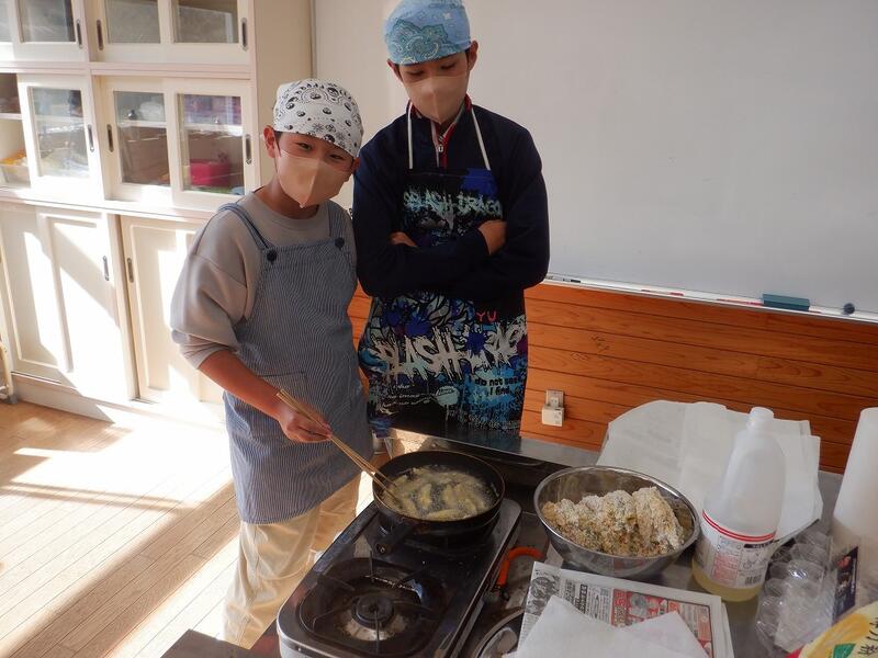 次に、たまご、片栗粉、パン粉をまぶし、フライパンで揚げます。家庭科室内に香ばしいにおいが広がり、すべてのコンロをフル稼動させながら、次々と熱々のアジフライが完成していきました。