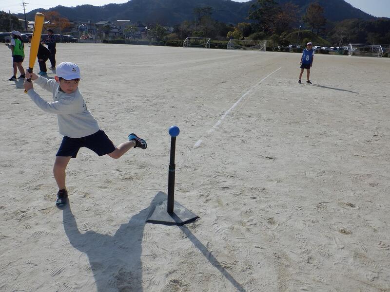海上タクシーで島を出て、バスで会場へ。開会式の後、午前中はとなりの補助グラウンドで野球を体験しました。講師の先生にごあいさつをして、まずは1人でボール遊び、次にペアになってゴロをキャッチする練習です。専門的な指導を受け、かなり上達しました。投げるコツを教えてもらってキャッチボールをした後、最後に簡単なゲームをしました。大きな学校の中に混ざり始めは恥ずかしそうでしたが、ナイスプレーがたくさん見られました。