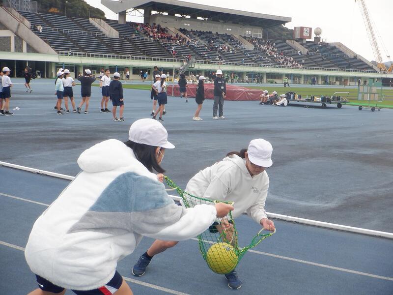 観客席でお弁当を食べた後、午後の部のスタート。始めは応援、次に生涯スポーツを体験しました。今回は、ペタンクグループとネットパスグループに分かれ、それぞれが気軽に楽しめるスポーツにチャレンジしました。