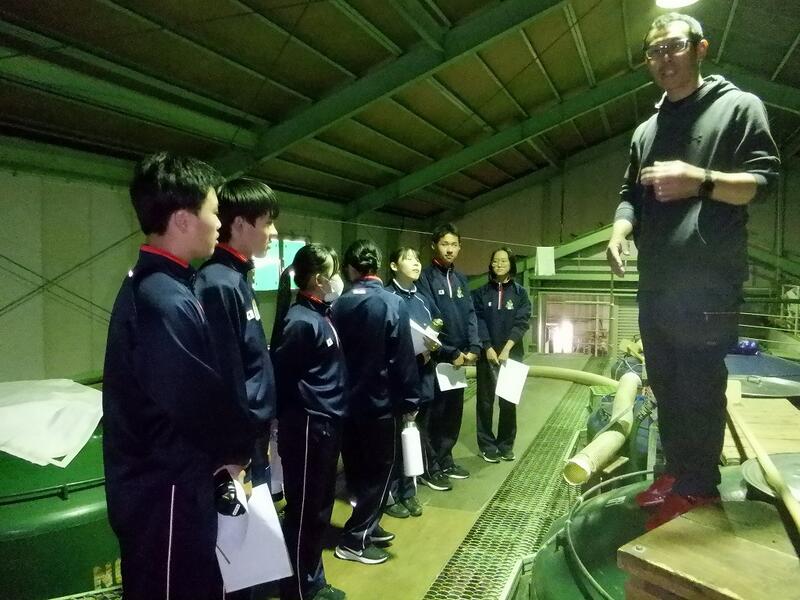 午後の酒造では、日本酒ができるまでの行程を説明してもらいながら、酒蔵の中を案内してもらいました。地元延岡で100年以上続く企業の伝統と技術のお話を熱心に聞いていました。途中、テレビでよく見る貯蔵タンクのある場所や30℃に保たれた麹菌を扱う場所もあり貴重な体験をさせていただきました。最後には酒造のオリジナル飲料を試飲させていただき、みんな舌鼓を打っていました。キャリア教育・ふるさと教育として行われた事業です。講師の方からは、生徒の将来に向けての想いを話していただきました。将来の生き方の参考にしてほしいお話でした。