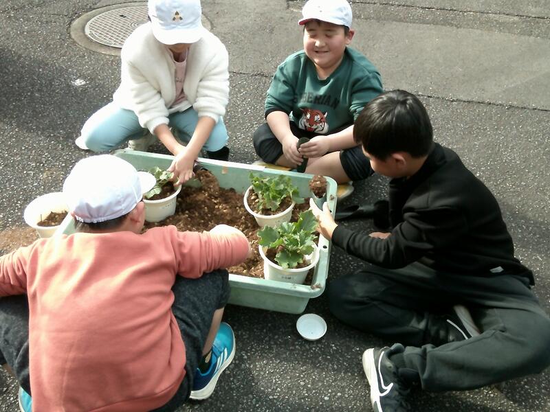 まずは、技術員さんが用意してくださった、自分のシールが貼ってある鉢に土と肥料を入れます。次に、サイネリアの苗を置き、周りに土をかぶせます。日当たりのよいところにあるフラワースタンドに自分の鉢を並べ、たっぷりと水をあげて作業は完了。毎年、何色の花が咲くか楽しみにしながらお世話をする子ども達。3月の卒業式に向けて、水やりをがんばります。