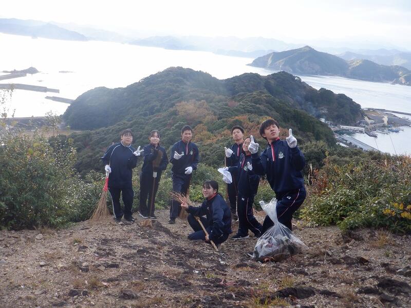 今日は後期課程の7人が、島のシンボルである遠見場山(とんばやま)の清掃活動を行いました。