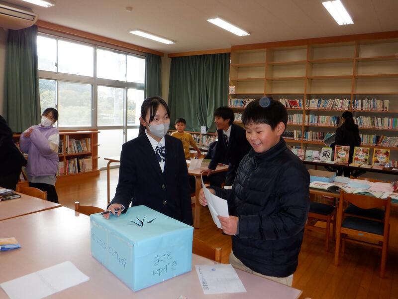 このイベントは委員会の学習担当が企画しました。まずは、クイズボックスの中に入っているクイズに答えます。それに正解するとスタンプがもらえます。そして、スタンプが全部たまると本の福袋をゲットできる、という仕組みです。いろいろな学年が混ざって、楽しそうに活動に取り組んでいました。
