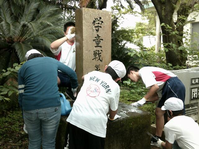 昨日、4~9年生が給食の後歩いて旧小学校へ。役割分担をしてから早速、作業に取りかかりました。ここ数日の雨で落ち葉が濡れていて集めるのが大変でしたが何とか袋に詰め、慰霊碑周辺の草を抜き、水をかけながらスポンジできれいにこすりました。そして最後に花を供えて、全員で黙祷を捧げました。さらにその後、前期課程は担任の先生より空襲の詳しい話を聞きました。