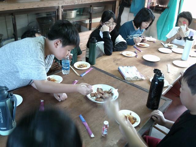 後期課程は、レクリェーションの後、調理実習です。今年も去年に引き続きカレーライス。野菜を切り、いため、肉を入れて煮込み、ルーを入れます。ここで、最後にかくし味の登場。グループによって違います。チョコレート、オイスターソース、はちみつ、牛乳、ケチャップなどなど。これが、味の決め手となりました。できあがったところで、全員で「いただきます」。やっぱり、自分たちで作ったカレーは最高においしく、あっという間に完食しました。