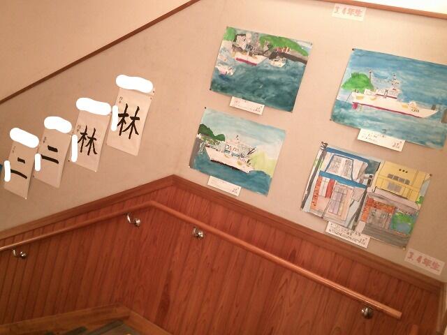 また、階段の掲示板には、これまでの絵・習字・島野浦マップなどの作品を展示しています。学校にお立ち寄りの際は、ぜひ、じっくりとご覧ください。