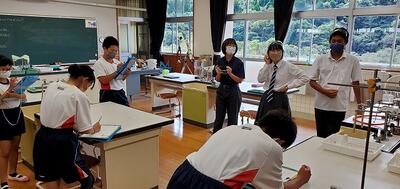 本日、7年生の理科の授業に、5・6年生が授業の内容を見学・質問にいきました。特に6年生は、半年後には7年生に進学しますので、キャリア教育の視点からも意義ある見学・質問の機会になりました。7年生にとっても、後輩からの質問に笑顔で答える場面もありました。先輩としての自覚も芽生えることでしょう。校舎の関係で、1~6年が2階、7~9年が3階で授業や生活を送っているので、全体で集まる以外にはあまり接点がないようです。このような活動が直ぐにできるのも義務教育学校の特徴の1つでもあります。