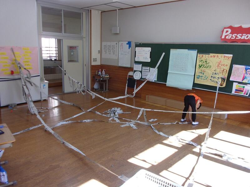 まずは拍手で二人を迎えたあと、自己紹介。校長先生のお話、校歌斉唱と続き、最後にじゃんけん列車をしました。ピアノの伴奏に合わせて歌いながら体育館内を歩き回り、歌が終わったら近くの人とじゃんけんをして列車がつながっていきます。全校児童生徒と職員が1本の列車になり、大変盛り上がりました。