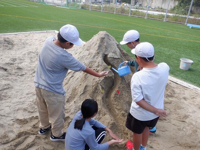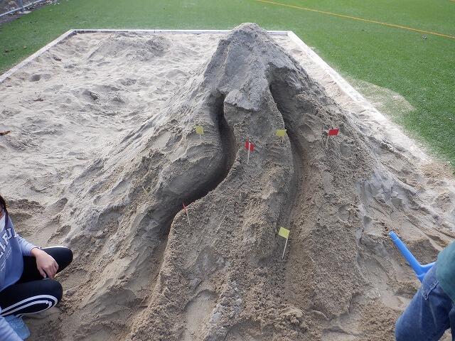 最近昼休みに前期児童がせっせと作っていた大きな山を実験の場としてお借りしました。まずはみんなで協力して、2本の川を作ります。カーブの内側と外側に旗を立て、いよいよ実験スタート。1本目は少量の水を流しました。流れが緩やかで、外側も少ししか削られません。2本目は、勢いよくじょうろから流し、最後はバケツの水を直接流しました。外側が大きく削られ、下流にはたくさんの砂が積もり、子ども達も思わず「お~っ」と歓声を上げていました。