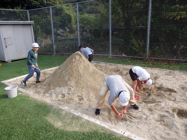 結果を確認した後は、もとの山に戻します。貸してもらったお礼に、少しだけ大きく(高く)しました。水の量が増えると削ったり運んだりするはたらきが大きくなることを、身をもって学んだ子ども達でした。