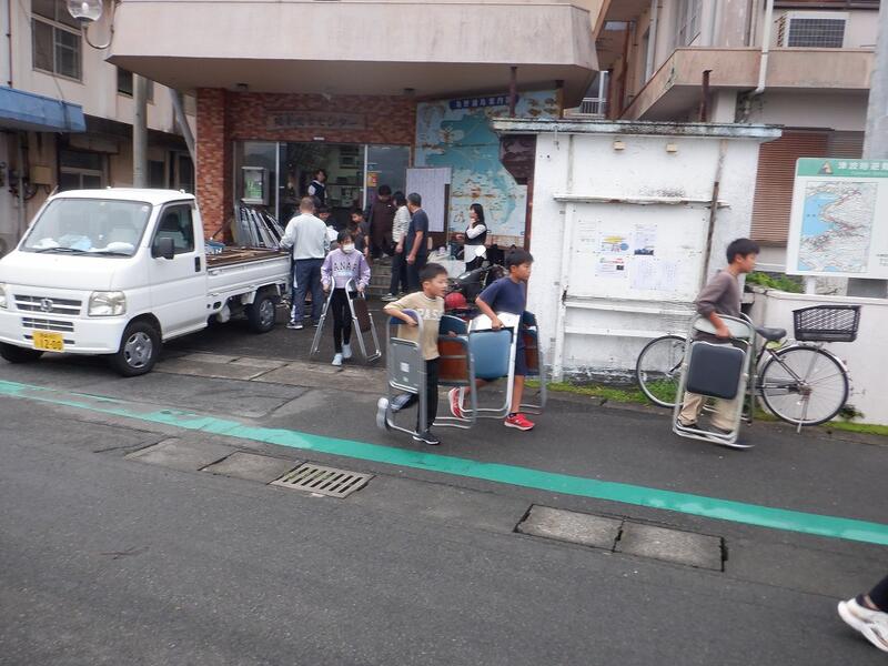 明日の神社大祭に備え、今日は朝から準備のお手伝いをしました。離島センターの3階から長机、椅子、テントを降ろし、前の広場に並べたり水揚げ場まで運んだりしました。島の一大イベントの運営に、少しでも協力することができたと思います。