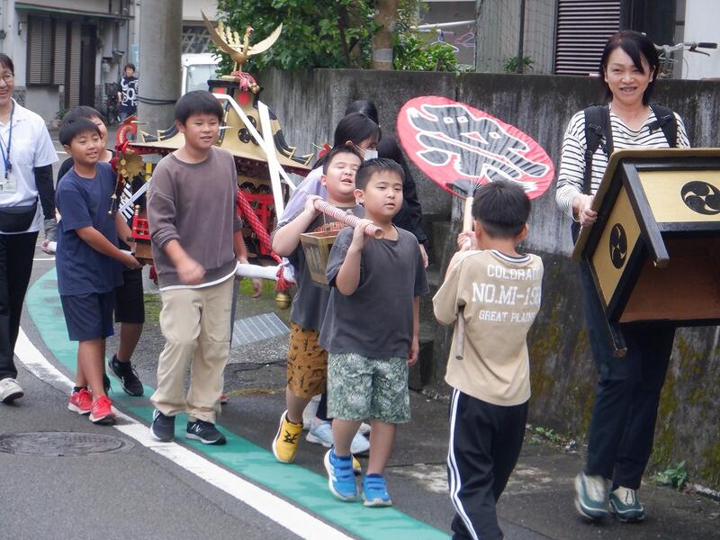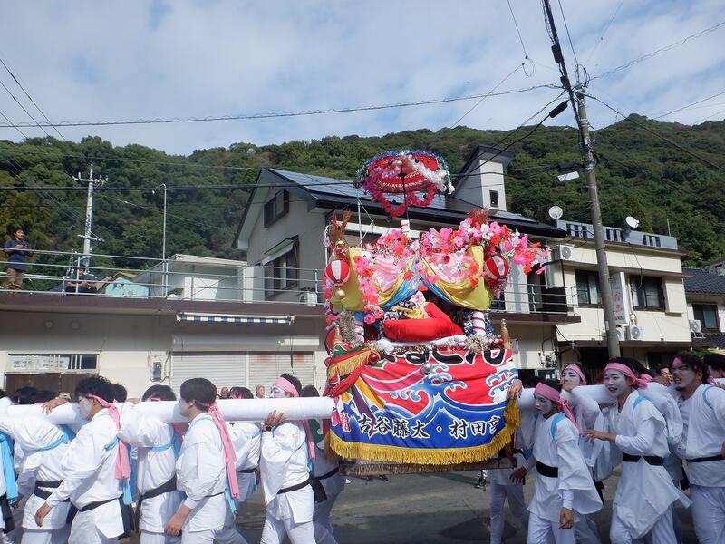 漁船に乗り込み海上パレードに参加した後、ようやく子ども達の出番です。まずは水揚げ場から神社下まで、うちわ・子ども神輿・お賽銭箱で練り歩き、祭りを盛り上げました。その後、神社下に太鼓台が到着。写真では分かりづらいですが、太鼓台の真ん中辺りで4人が懸命に太鼓を叩いています。