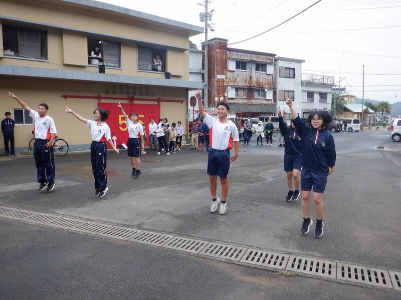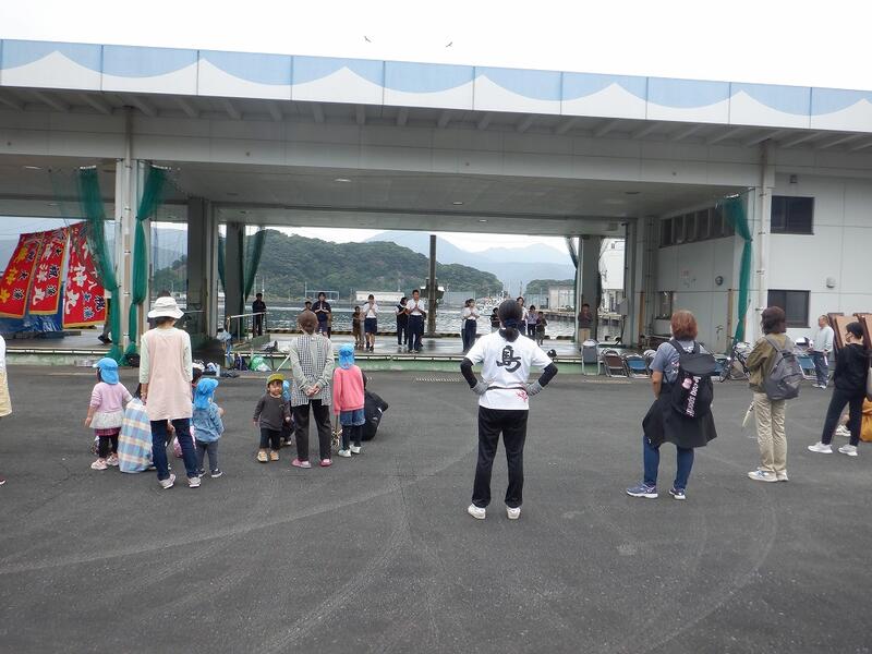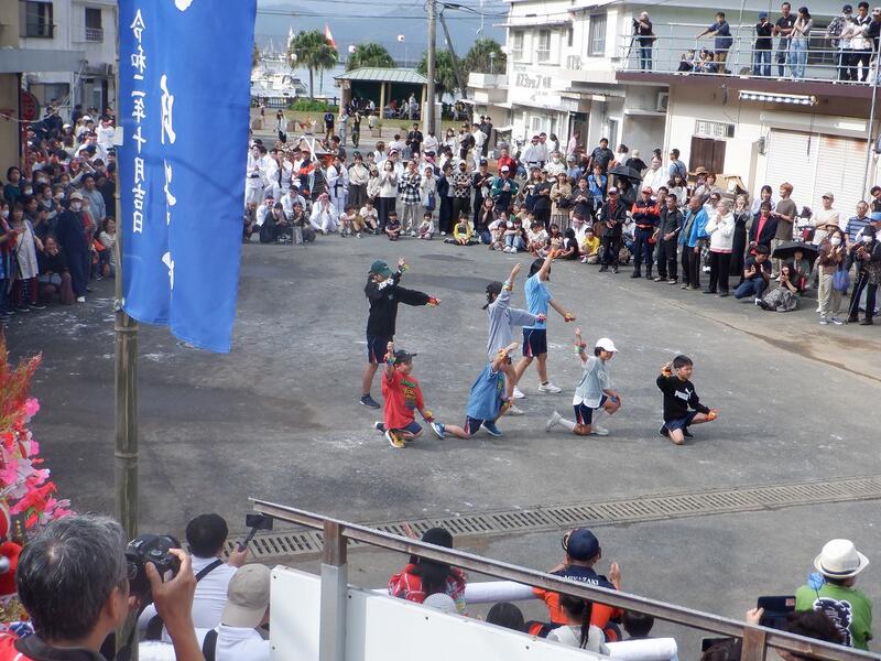 お昼ご飯にカレーライスをいただき、パワーも回復。午後は会場を水揚げ場に移し、後期課程・前期課程の順にもう一度ダンスを踊り、最後に全校児童生徒で、「ダイナミック琉球」を披露しました。ご観覧いただいた島内外の方々から、大きな歓声と拍手がわき起こっていました。